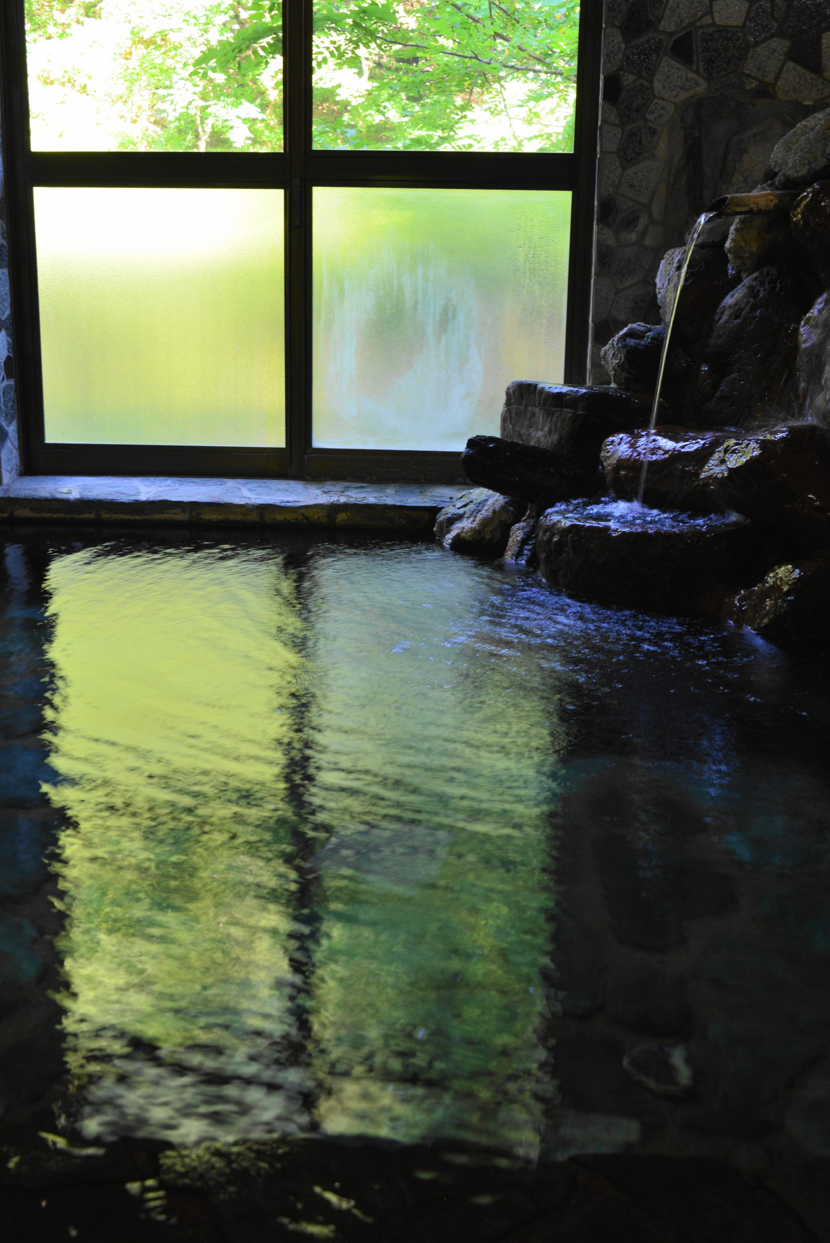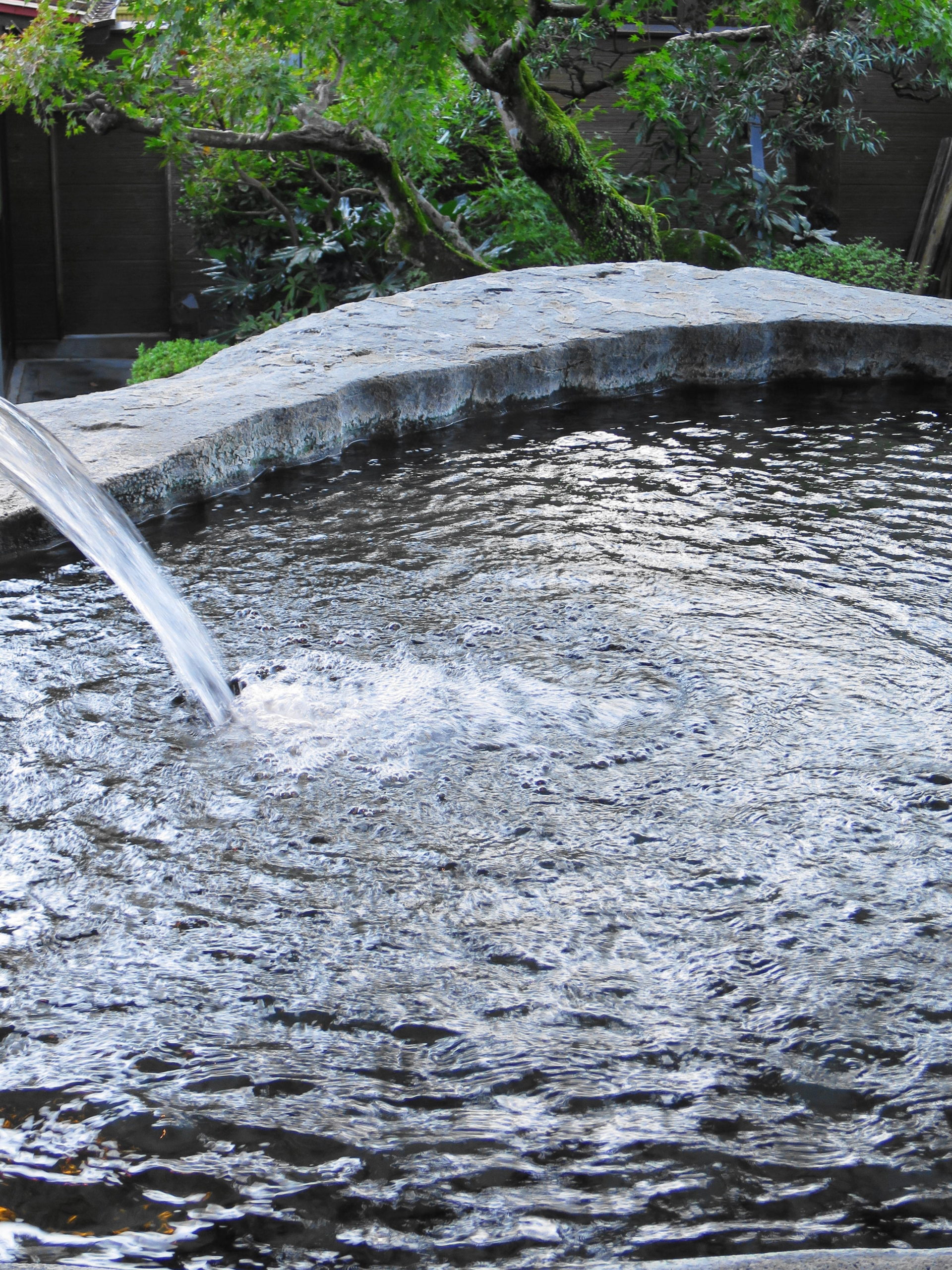 巨石から源泉掛け流しの湯が溢れています。