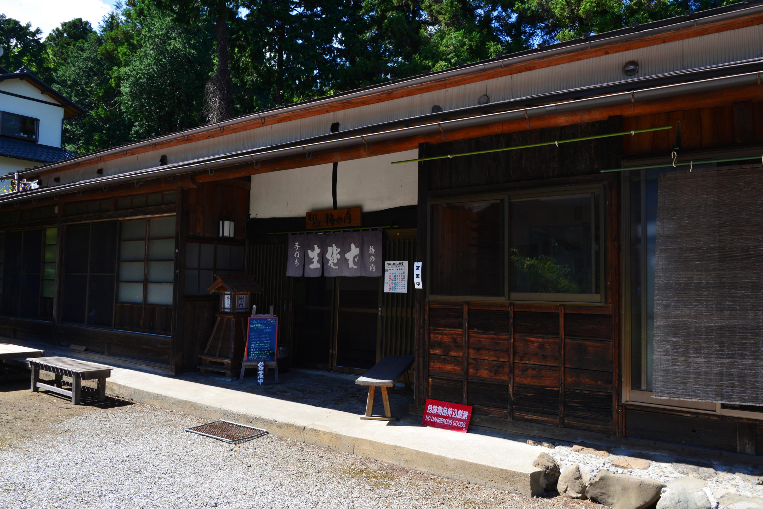 蕎麦屋を求めて周辺を流しているうちに、「手打ち十割蕎麦」の看板を見つけ、普通車がギリギリ通れるクランクを進むと現れたのが、「手打ちそば 梅……