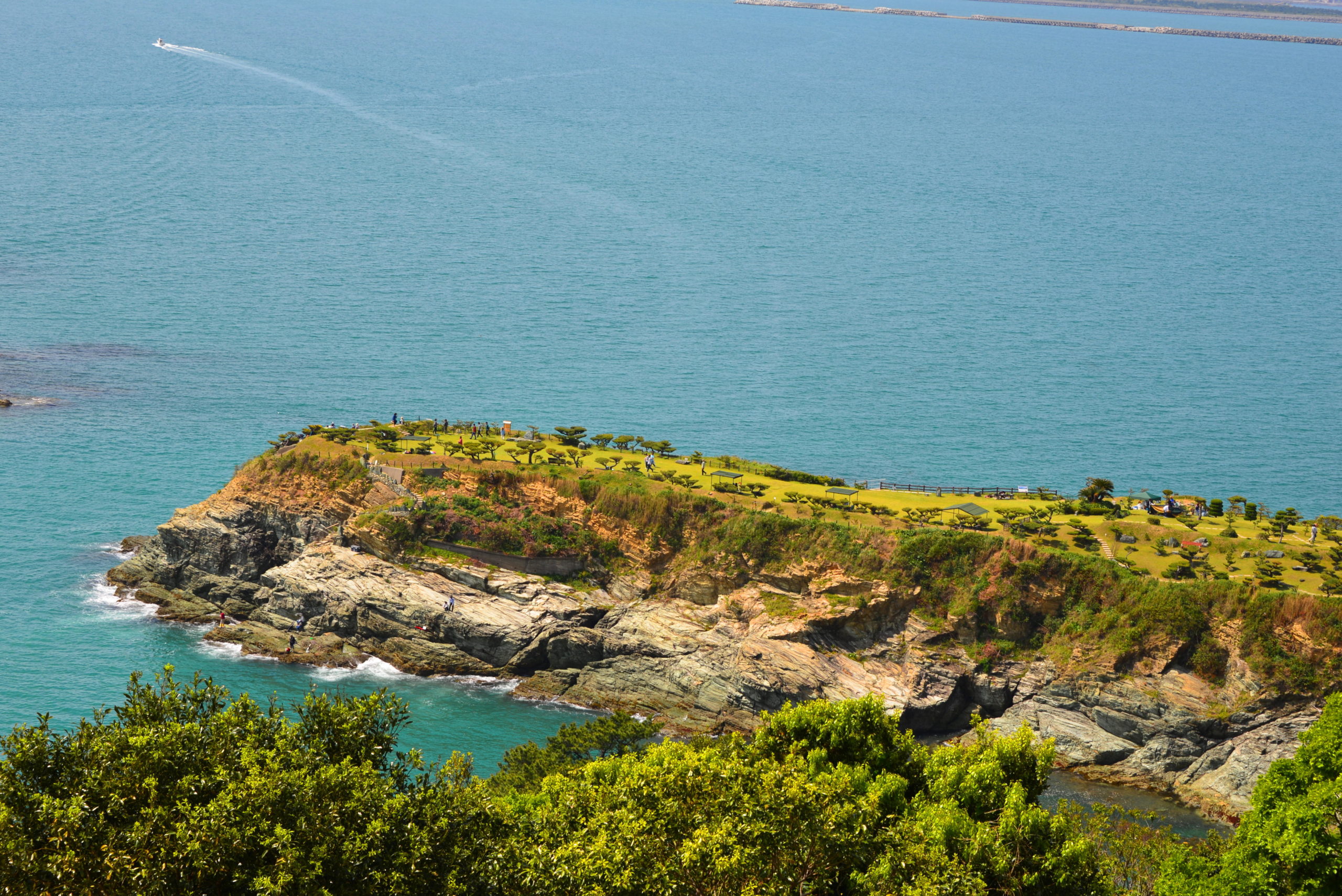 紀淡海峡に突き出た鼻(岬)に、かつて、紀州藩の海防番所が置かれていました。その跡地に、松と芝を植え、石を配し、整備されたのが番所庭園です。